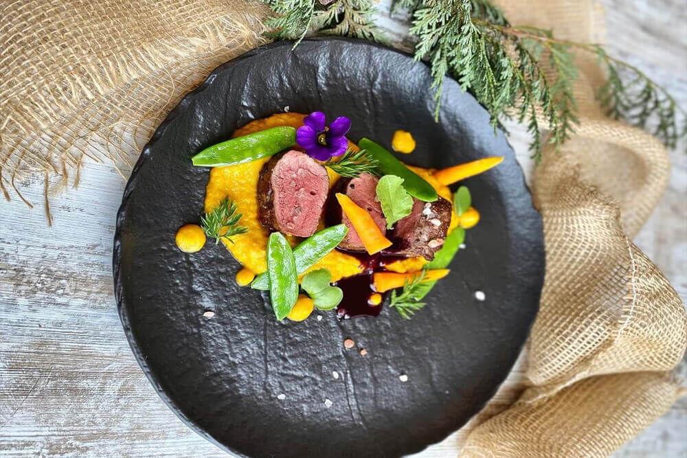 Recept: Srnčí hřbet, karotkové pyré, mladý hrášok a vínna omáčka