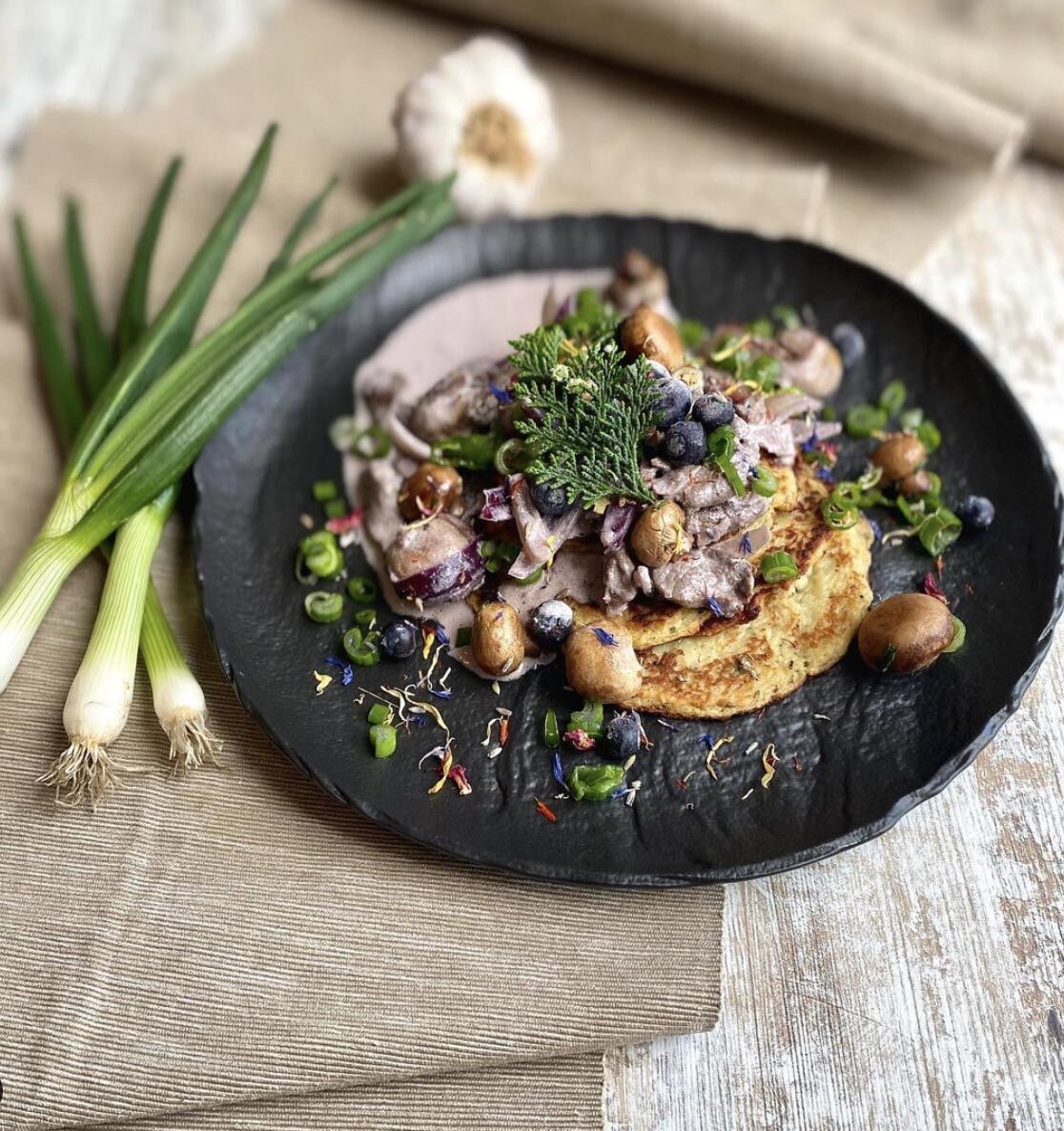 Recept: Zverinové soté, zemiakové placky s čerstvou majoránkou, tymiánové huby, čučoriedky